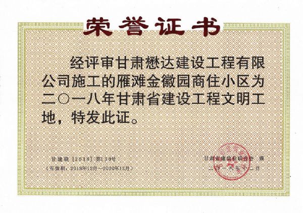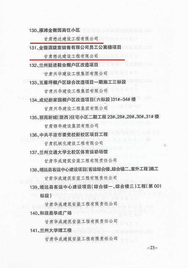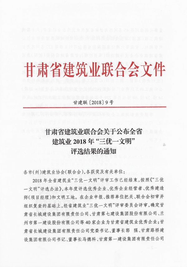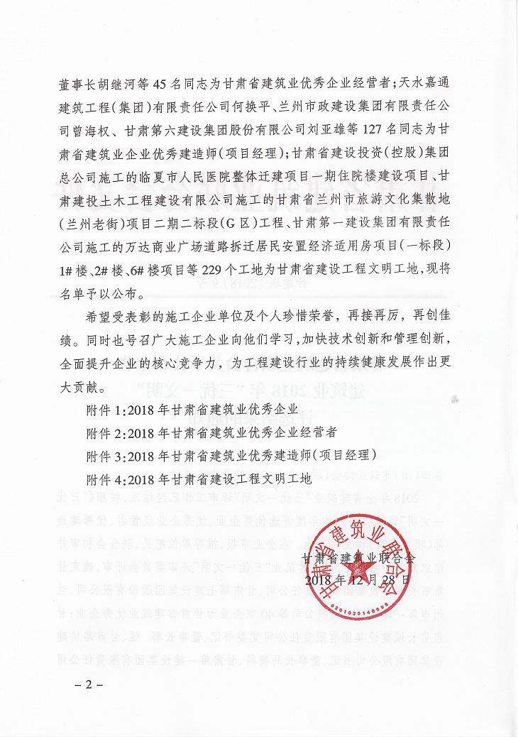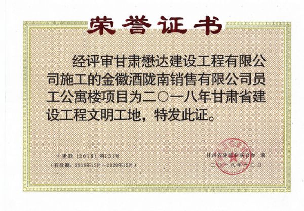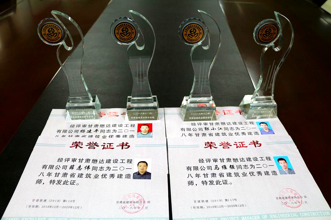 近日,2018年全省建筑業“三優一文明”評選結果揭曉,甘肅懋達建設工程有限公司獲評“甘肅省優秀建筑業企業”稱號,董事長李鎖銀榮獲“甘肅省優秀建筑業企業經營者”稱號,金徽酒隴南銷售公司員工公寓樓項目、雁灘金徽園金徽園商住小區獲評“甘肅省建設工程文明工地”稱號,馬維強、薛志偉、楊建平、郭小江等4人獲評“甘肅省建筑業優秀建造師”稱號。