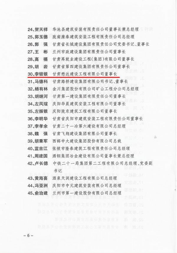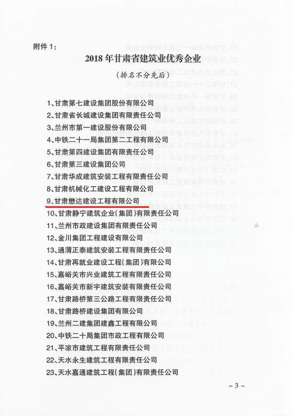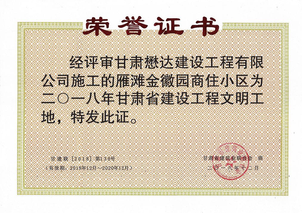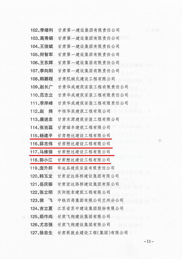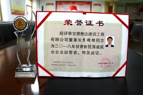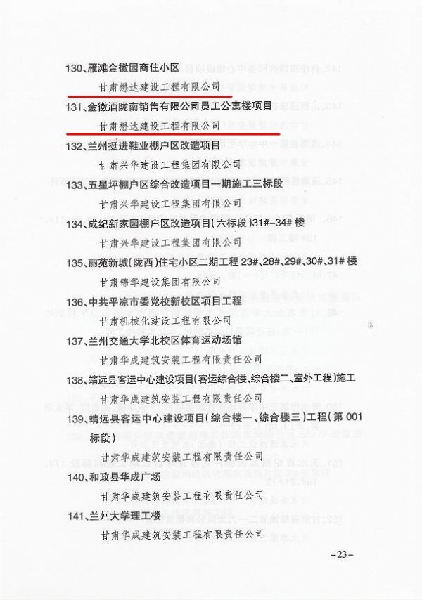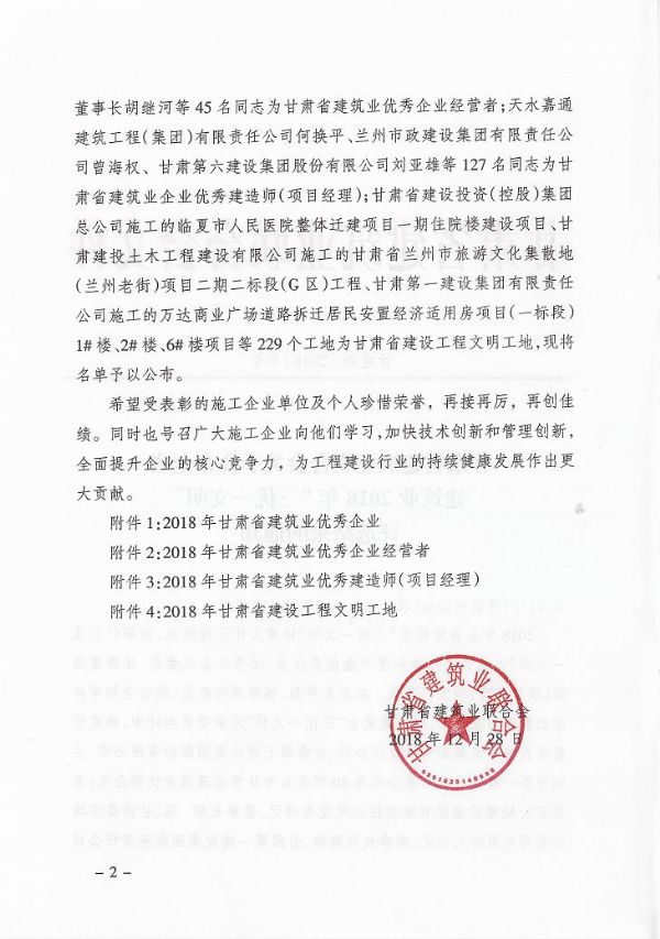 近日,2018年全省建筑業“三優一文明”評選結果揭曉,甘肅懋達建設工程有限公司獲評“甘肅省優秀建筑業企業”稱號,董事長李鎖銀榮獲“甘肅省優秀建筑業企業經營者”稱號,金徽酒隴南銷售公司員工公寓樓項目、雁灘金徽園金徽園商住小區獲評“甘肅省建設工程文明工地”稱號,馬維強、薛志偉、楊建平、郭小江等4人獲評“甘肅省建筑業優秀建造師”稱號。
